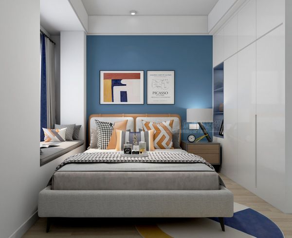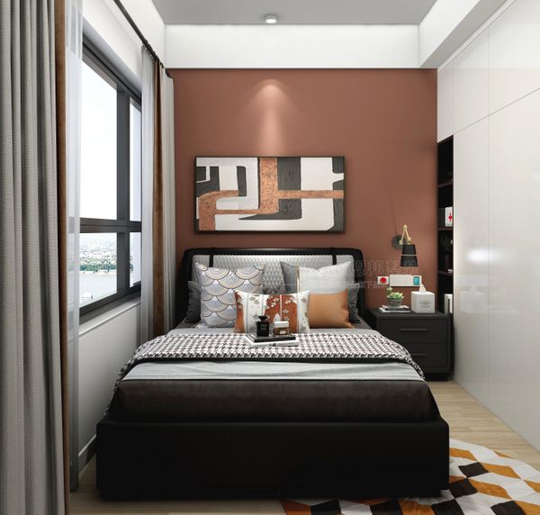 家具及灯饰展现出现代简约的氛围。皮质的床与床头柜,材质、颜色等和客厅的家具统一。窗帘与背景的海港蓝与床的暖色相结合,组成了一个现代个性的主卧空间。